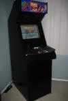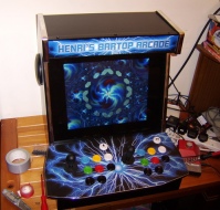 "I've used a 17 inch lcd screen and made it using mdf sheets. I had the use of a nice sized workshop to build and paint it from my gf's sister (Big Props to her!) . I also fitted a dvd drive to the side of the machine so a music disc or dvd can easily be inserted. This machine also has a subwoofer fitted as well as two 100 watt speakers with the volume controlled externally. There is a 80mm fan fitted to the back and I've fed this with 5 volts to keep noise from the fan very low. I used a cold cathode light to light up the marquee, this worked really well because there is a nice white light with little or no heat generated (highly recommended for narrow marquees) I used chrome trim all round inc. the control panel, this looks excellent with the black finish. The control panel and marquee were supplied by Scott from mamemarquee.com ( he did a great job and to exact specs too! ) . It has jukebox mode, karaoke mode, dvd, mame, emulators, radio, picture display, weather reports and just about anything else I can cram into it! All in all its a nice machine and I will make another some time in the future. It worked out at about 80 pounds so it is quite heavy but it makes up for it in size, its neat enough to fit in any room really and that was one of the biggest objectives for this project. As for the painting I put 6 layers of white paint on it and then 6 layers of black paint, I didn't use any sideart, that's for Henri to decide whether or not he wants to have it on there."