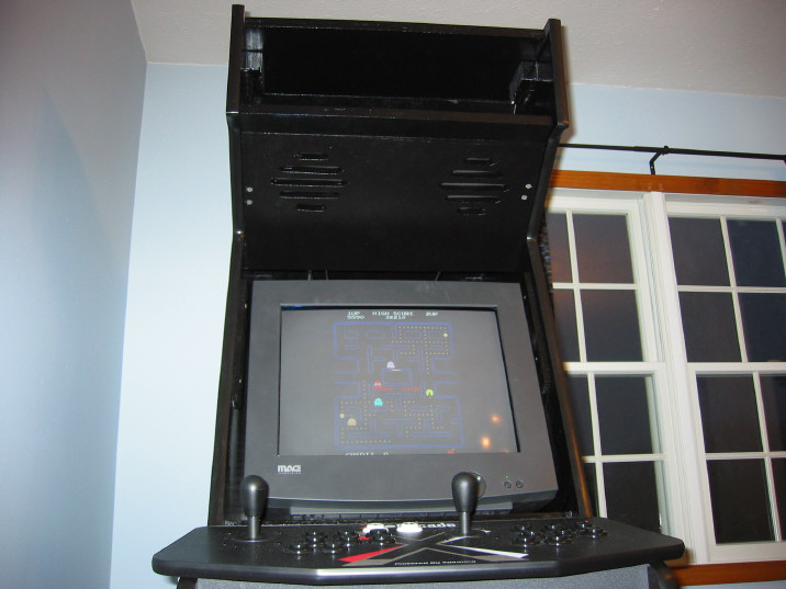 speakers. I then cut two pieces of fabric (actually a black bed sheet) and stapled the pieces to the backside of the board. I then screwed in four cuphooks, for the wiring to loop around. Then I, very elegantly, strapped the speakers down using some spare speaker cord I had laying around and a little electrical tape for good measure. I made sure the on/off button was extended into one of the cutouts so it would still be useable. I then attached it to the cabinet by screwing four screws into the ledgers found on either side. From the playing position you cannot even see the speakers. The fabric keeps them totally invisible. There are two protuberances on the left speaker, the volume and the on/off. The on/off switch can still be used as it is a simple toggle. The volume can now only be adjusted through Windows. This is not a big deal.